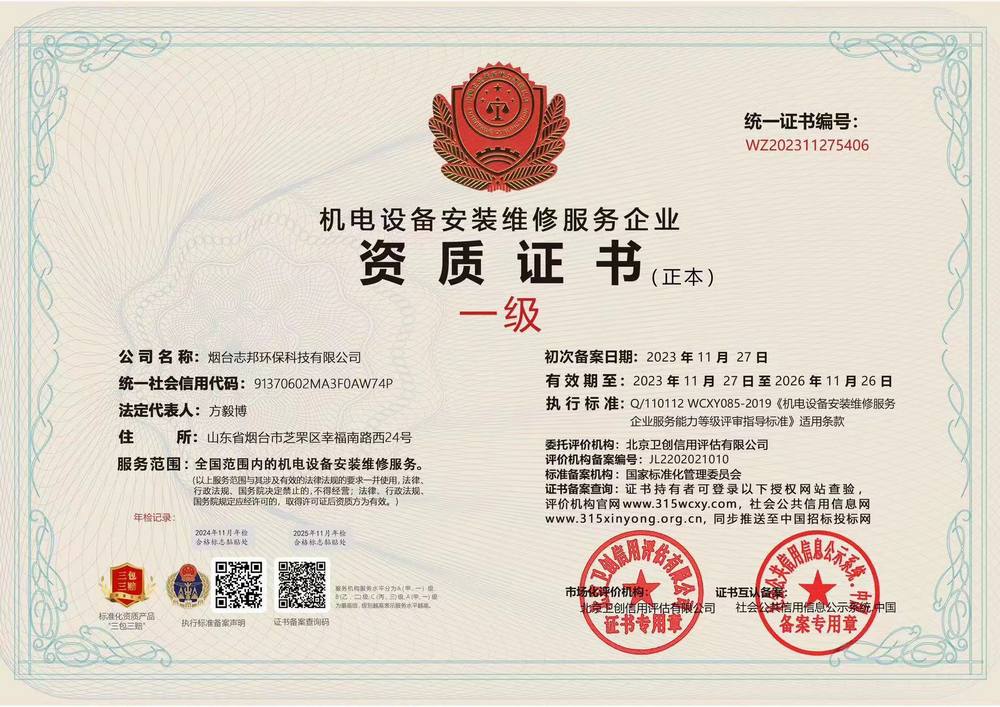 機電設備安裝維修服務企業資質證書 一級